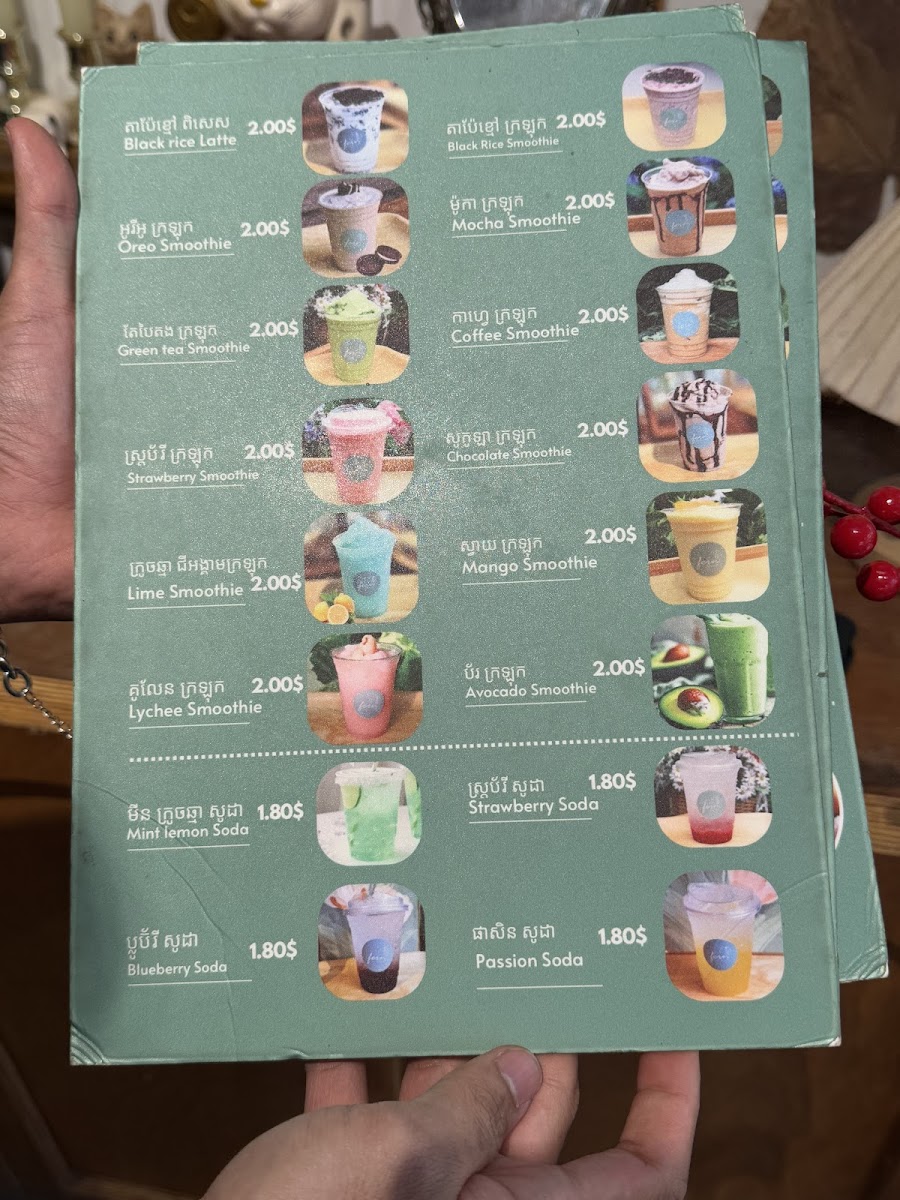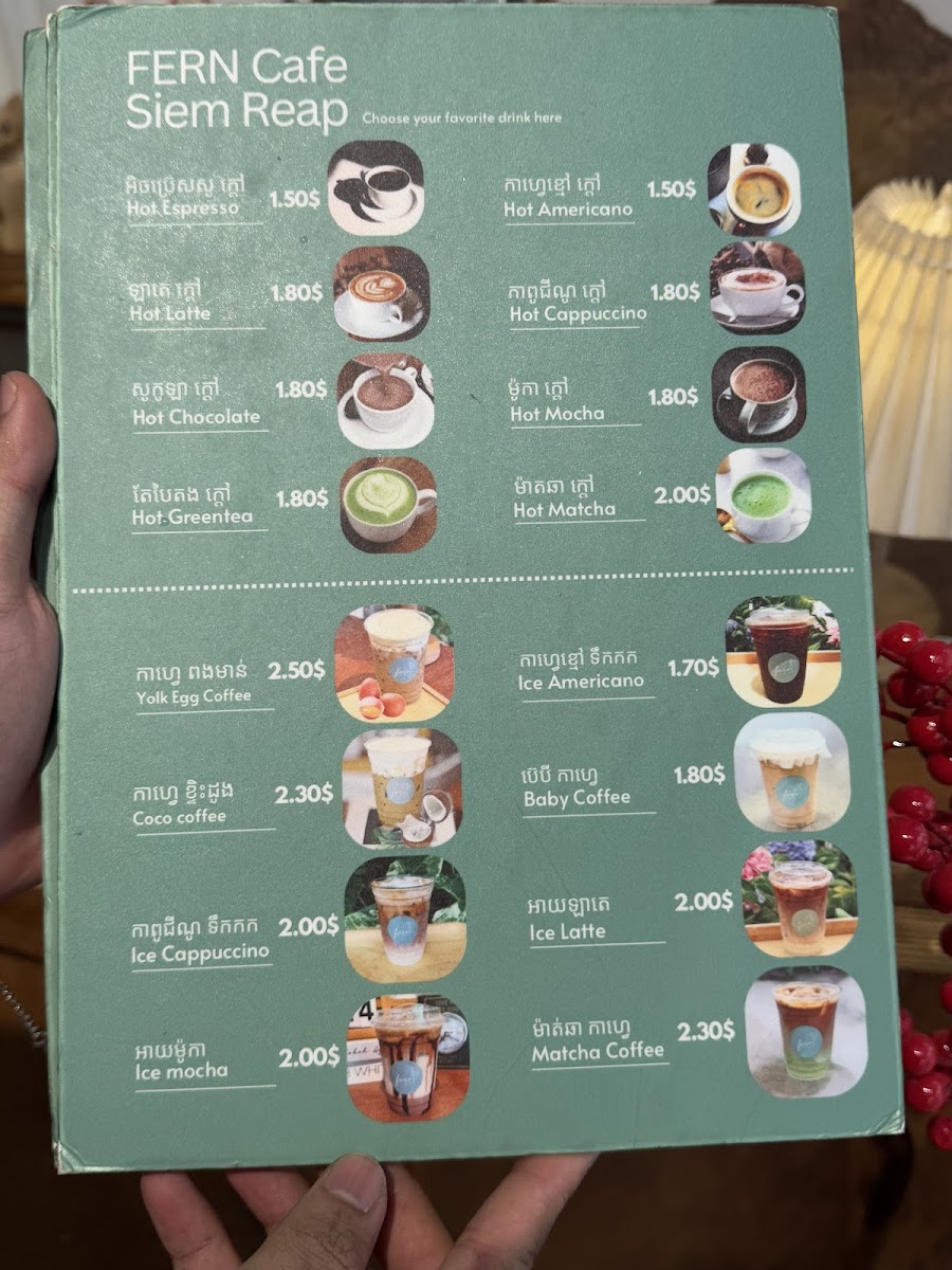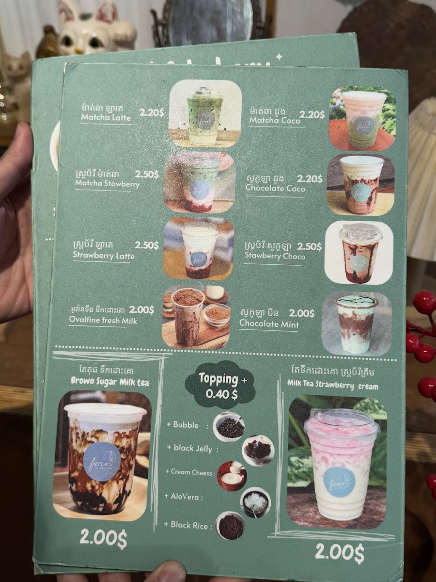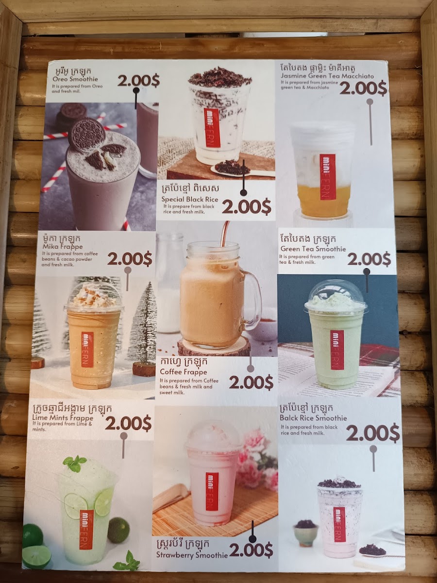 From a reviewer’s perspective, the menu at Fern Cafe Siemreap offers a pleasantly diverse mix of refreshing drinks and light bites, making it a versatile spot for casual visits. The frappe selection, including Moca Frappe, Coffee Frappe, Lychee Frappe, and Mango Frappe, pairs well with their smoothie options like Black Rice Smoothie, Strawberry Smoothie, Chocolate Smoothie, and Green Tea Smoothie, alongside the refreshing Lime Mints Frappe. Their macchiato lineup stands out with unique choices such as Jasmine Green Tea Macchiatos, Thai Tea Macchiato, Green Tea Macchiato, Red Tea Macchiato, and Passion Cream Cheese. For something more filling, the snack section offers portions like Small, Medium, and Spagetti Cabonara, while seasonal drinks such as Strawberry Macha, Strawberry Latte, and Choco Strawberry add a creative twist. Classic options are also well covered with hot beverages like Hot Green Tea, Hot Americano, Hot Cappuccino, Hot Chocolate, and Hot Latte, as well as fresh teas including Green Lychee, Jasmine Lychee, Supper Fresh Tea, Honey Green Tea, and Honey Red Tea. The milk-based drinks, such as Brown Sugar Milk Tea and Black Rice Milk, along with iced selections like Chocolate Mint, Ice Latte, Matcha Coco, Baby Coffee, and Ice Americano, round out a menu that feels both varied and approachable, even though pricing details are not specified.