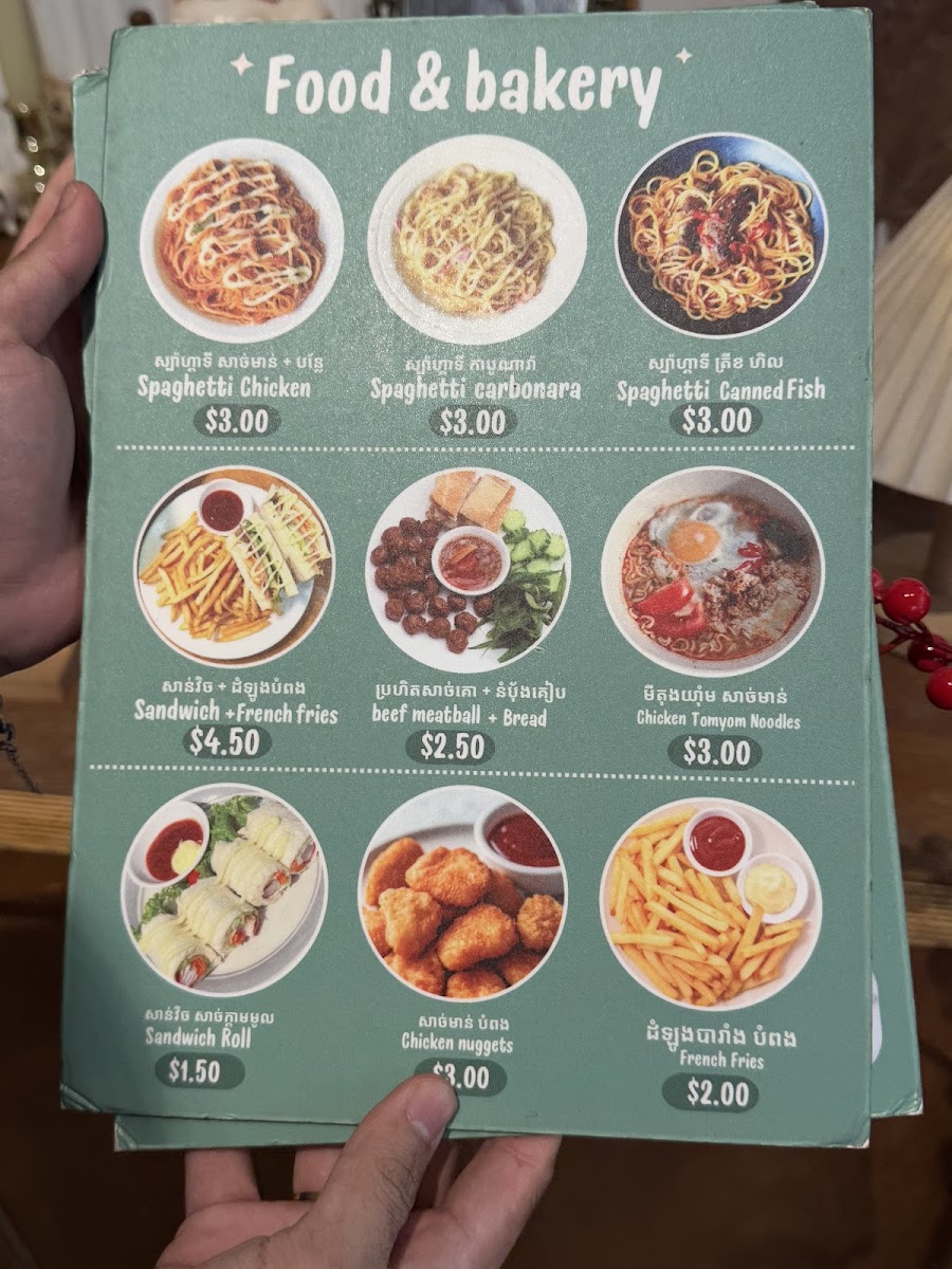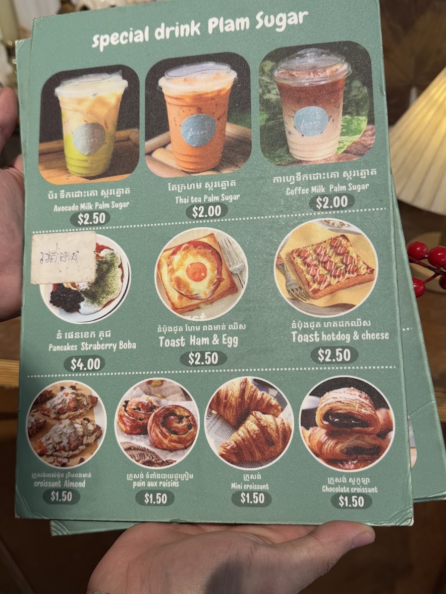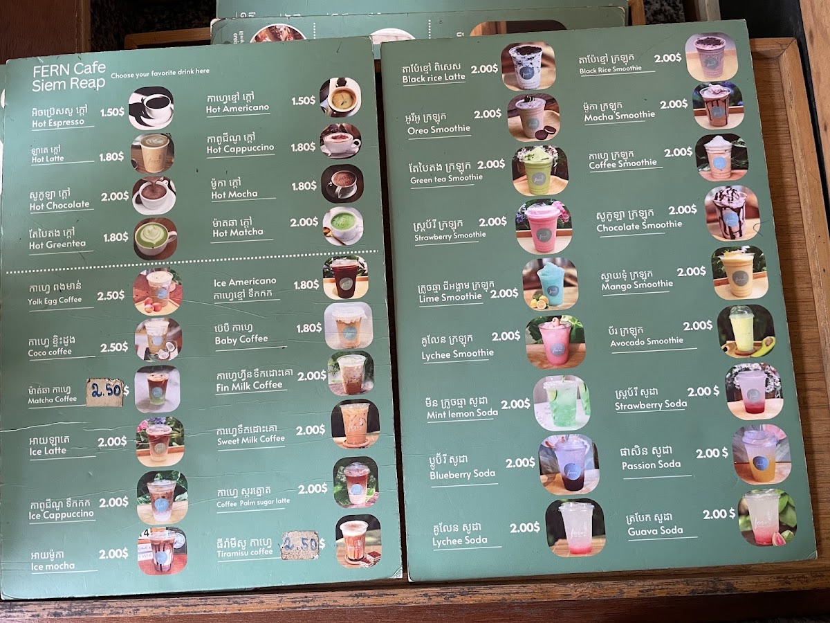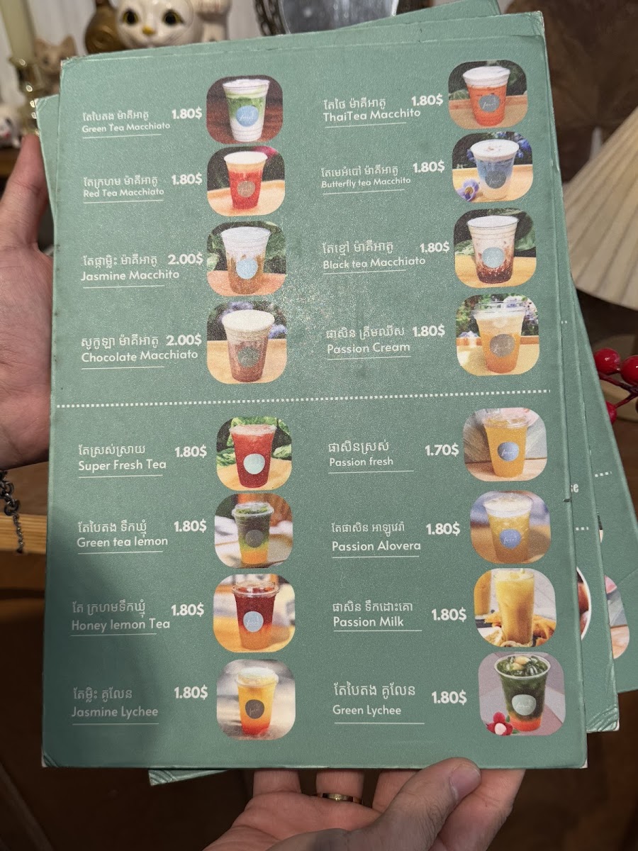 From a reviewer’s perspective, the menu at Fern Cafe Siemreap offers a pleasantly diverse mix of refreshing drinks and light bites, making it a versatile spot for casual visits. The frappe selection, including Moca Frappe, Coffee Frappe, Lychee Frappe, and Mango Frappe, pairs well with their smoothie options like Black Rice Smoothie, Strawberry Smoothie, Chocolate Smoothie, and Green Tea Smoothie, alongside the refreshing Lime Mints Frappe. Their macchiato lineup stands out with unique choices such as Jasmine Green Tea Macchiatos, Thai Tea Macchiato, Green Tea Macchiato, Red Tea Macchiato, and Passion Cream Cheese. For something more filling, the snack section offers portions like Small, Medium, and Spagetti Cabonara, while seasonal drinks such as Strawberry Macha, Strawberry Latte, and Choco Strawberry add a creative twist. Classic options are also well covered with hot beverages like Hot Green Tea, Hot Americano, Hot Cappuccino, Hot Chocolate, and Hot Latte, as well as fresh teas including Green Lychee, Jasmine Lychee, Supper Fresh Tea, Honey Green Tea, and Honey Red Tea. The milk-based drinks, such as Brown Sugar Milk Tea and Black Rice Milk, along with iced selections like Chocolate Mint, Ice Latte, Matcha Coco, Baby Coffee, and Ice Americano, round out a menu that feels both varied and approachable, even though pricing details are not specified.